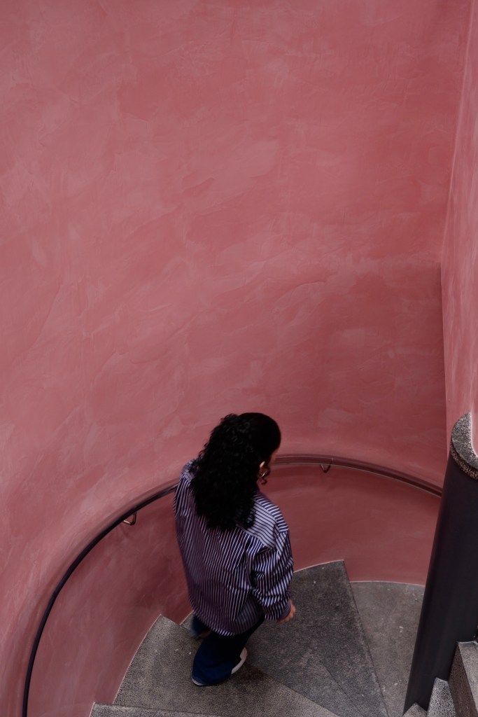 In 1997 founder and director Jonny Johansson created raw denim jeans with pink stitching on the inside, which then would become a staple of the brand. (Same pink color painted on the facade, and interior stairs).