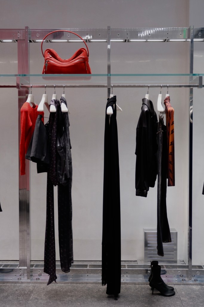 The entire space itself was designed by Swedish studio Halleroed. They translated the brands fashion into architecture. They layered many materials from high-gloss aluminum panels, plaster walls, and black granite steps to create a movement guide through the store. Every element, from lighting to custom furniture, was calculated to support Acne’s aesthetic, creating a store that is functional, experiential, and deeply reflective of the brand’s identity.