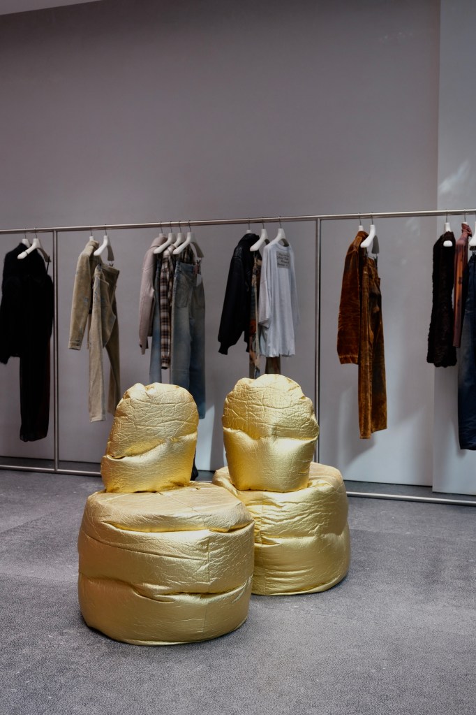 The furniture in the Miami store was designed by Max Lamb. He is a longtime collaborator of the Acne Studios brand. His pieces are sculptural, but also organic, and inviting. The golden tones in the furniture add warmth and a subtle sense of luxury, catching the light just right and highlighting the clothing around it.