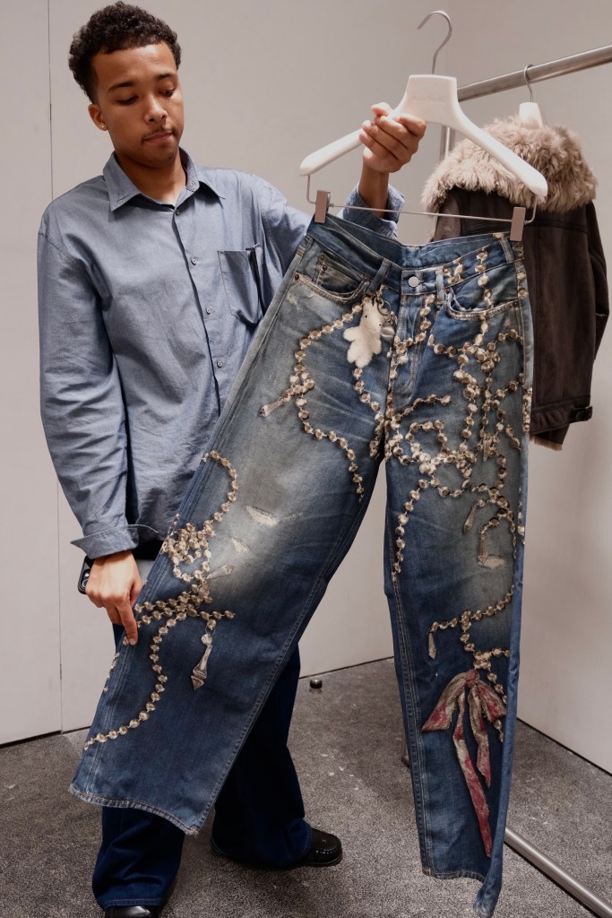 While at the store, I spoke with one of the team members who gave me a deep dive of the brand’s philosophy. He also explained to me that in the latest collection from Acne Studios, we see objects printed on jeans. One object in particular is a teddy bear. According to creative director Jonny Johansson, the idea stemmed from a beloved childhood teddy bear keychain that found its way into the collection. The motif evokes the softness and nostalgia. In this way, Acne Studios uses the teddy bear motif to bridge memory, texture and surprise in luxury denim.